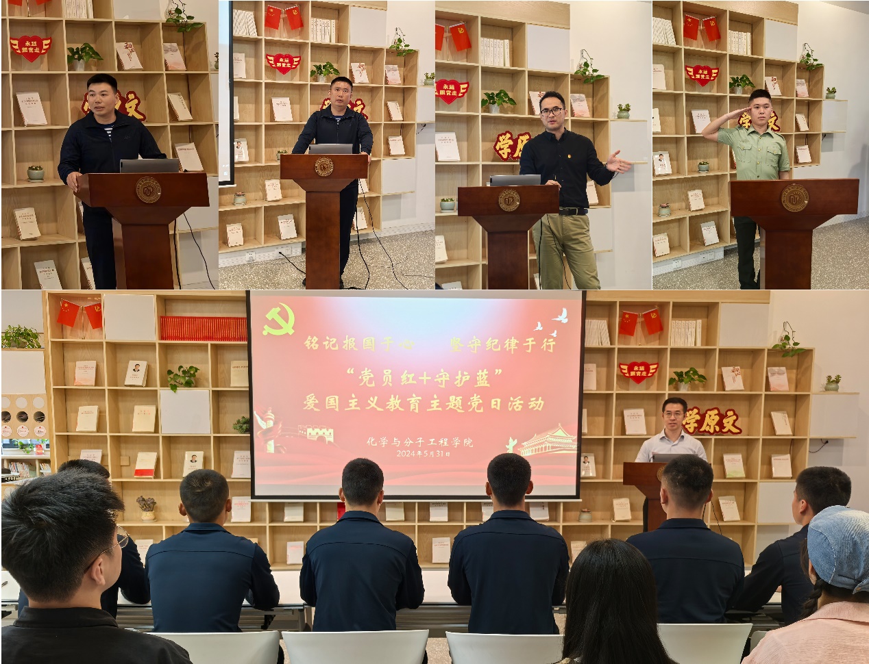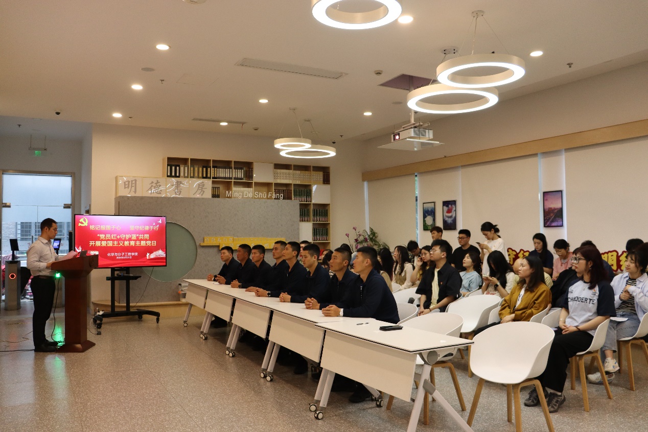 筑魂强纪,共筑信仰基石;携手育才,同谱军校华章。为推进党纪学习教育走深走实,以“大思政课”拓展全面育人新格局,引领青年学子心怀“国之大者”,坚定理想信念,近日,化学与分子工程学院联合海军某部组织开展了“铭记报国于心,坚守纪律于行”主题党日观摩活动,以“党员红+守护蓝”厚植爱国情怀,砥砺强国之志。365英国上市集团官网化学学院副教授郭勇、2名海军官兵以及退伍学生周业坤受邀分享科技报国、参军报国的故事。海军某部官兵代表以及精细化工研究生党支部学生党员参加了活动,来自兄弟学院的师生党支部书记代表观摩了活动。活动由化学学院党委副书记孟庆鹏主持。