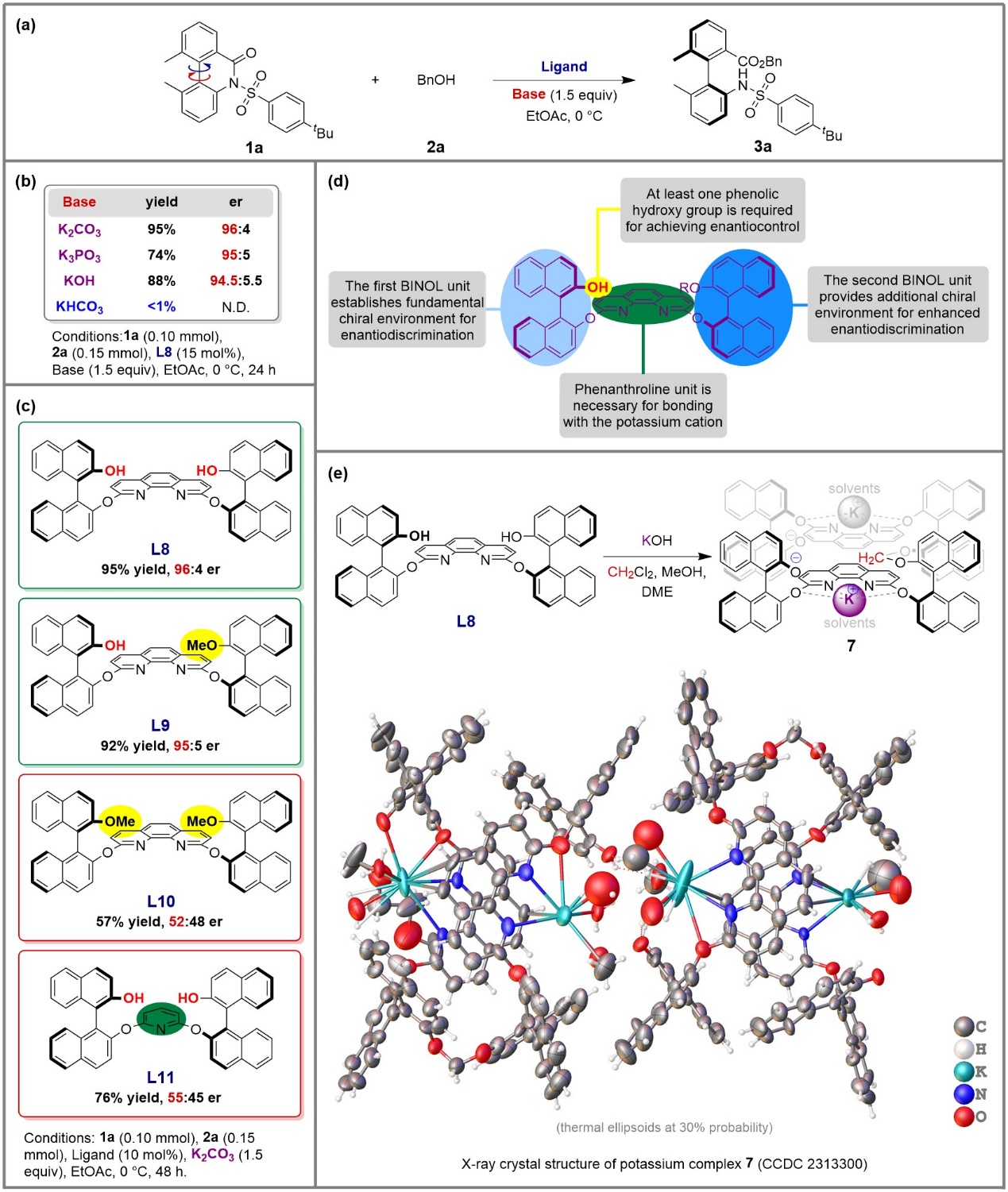图1. 研究背景和新型轴手性菲罗啉钾络合物用于非天然轴手性氨基酸的催化合成