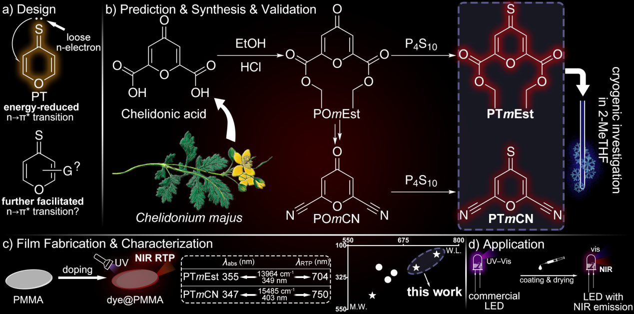 近期,该团队利用硫代羰基化合物内禀的低能量激发态以及辅助的吸电子基团协同的策略,开发了一种具有近红外室温磷光发射的单环小分子体系。研究人员通过使用密度泛函理论(DFT)计算预测了设计染料分子的性质,成功合成了两个此类分子(PTmEst和PTmCN),并研究了其基本光物理性质,同时使用聚合物作为基质以赋予其RTP性能。结果显示,吸电子基团成功辅助了硫原子高能量孤对电子的n→π*跃迁,发光体的最大发射波长为750nm,Stokes位移为15485 cm-1(403 nm),而分子量仅为162。该研究为小分子实现近红外室温磷光提供了一种有趣的策略。
