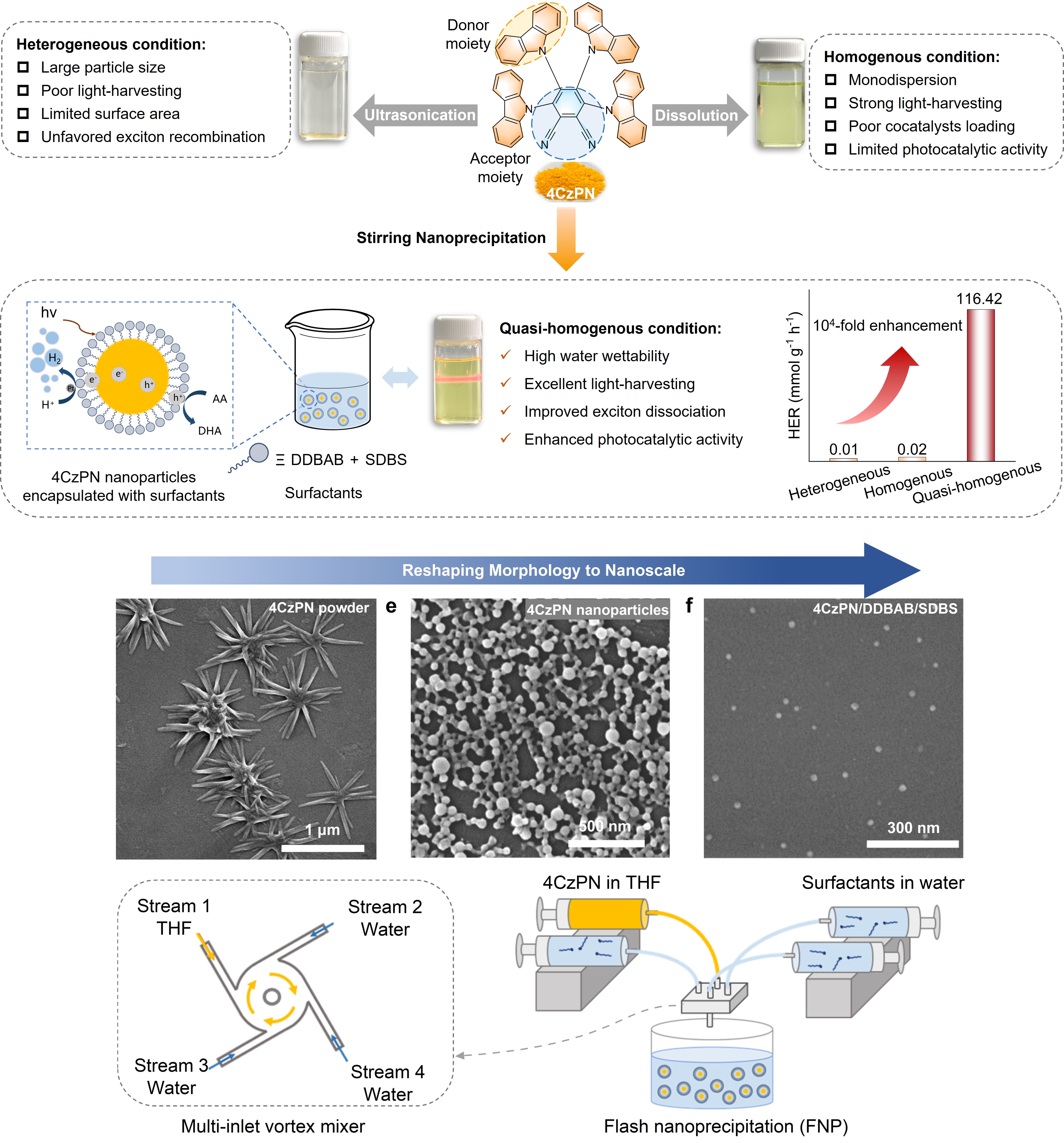 为了解决上述瓶颈问题,研究团队创新性地提出了一种基于阴阳离子双面表面活性剂限域组装的策略,成功地将具有供体-受体(D-A)结构的单组分小分子材料(4CzPN)由原始的微米级颗粒“重塑”(Reshape)为尺寸均一、形貌规整的纳米有机光催化剂(~ 60 纳米)。由于表面活性剂的限域,该纳米光催化剂可以在水相环境中均匀分散,形成准均相纳米光催化水溶液,其粒径分布可以在至少30天的时间内保持稳定。与传统的超声分散异相催化剂相比,该准均相光催化剂表现出光吸收性能、激子解离效率和水润湿性的同步提升,其光催化制氢速率(HER)提升了四个数量级,达到116.42 mmol g⁻¹h⁻¹,并且在365 nm光照下的表观量子效率(AQY)高达30.2%,位于目前单结有机光催化剂的前列。值得一提的是,研究团队在该策略中创新使用了双表面活性剂限域,有效降低了纳米光催化剂的表面曲率和静电排斥作用,从而强化了胶束的形成并提高其光催化反应的稳定性。高分辨透射电子显微镜(HR-TEM)和理论计算还表明纳米光催化剂外层包裹的离子性表面活性剂可以提高助催化剂的负载,并促进光生激子的解离以及电荷的生成。这些研究结果共同揭示了催化剂形貌和界面微环境的调控对于有机光催化剂分解水反应过程的关键作用。