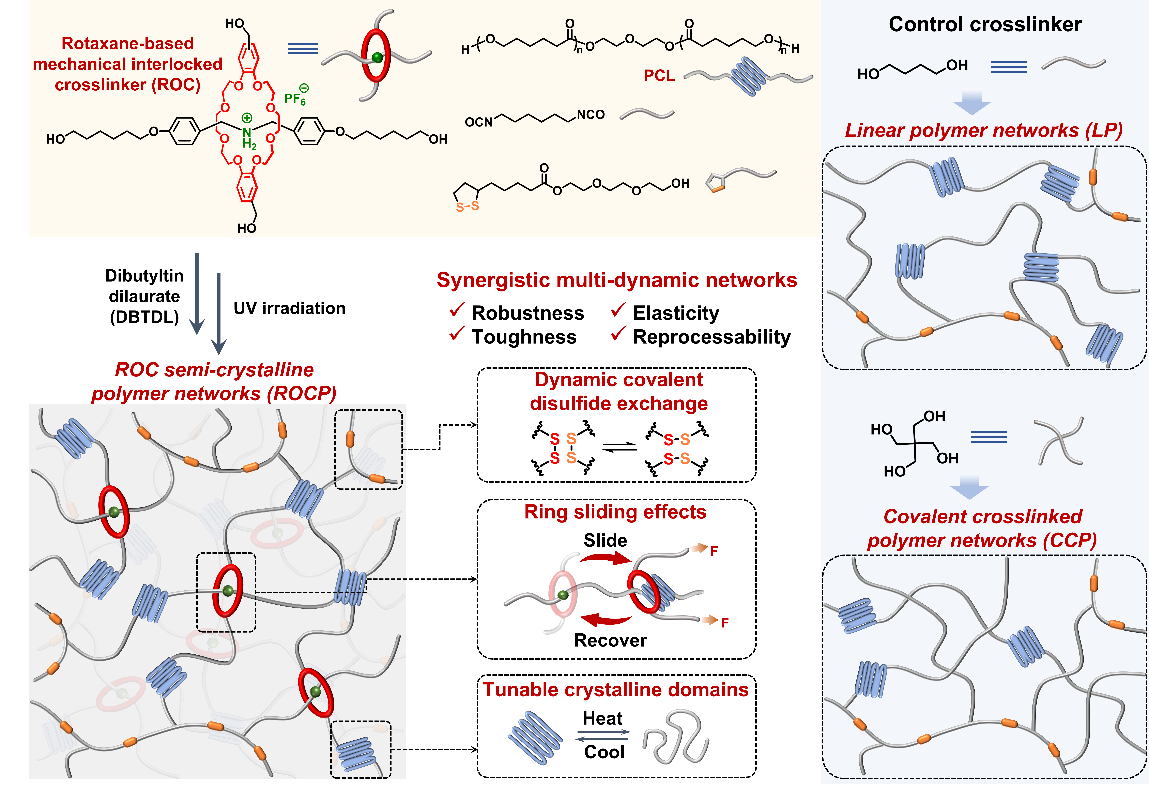近年来,机械键化学蓬勃发展,其兼具稳定性和动态性,为材料的性能提升提供了新的策略。研究者们将机械键与其它动态组分协同作用,以获得高性能动态材料。然而,综合材料性能的提高主要依赖于非共价牺牲键介导的能量耗散机制。在这种情况下,网络的不完全恢复可能会对材料的抗疲劳性和回弹性产生负面影响,甚至破坏致动器、传感器、离子导体等功能材料的稳定性和耐久性。因此,为了扩大高性能聚合物的应用领域,实现材料机械强度、韧性和弹性的同步提升至关重要,但也极具挑战性。