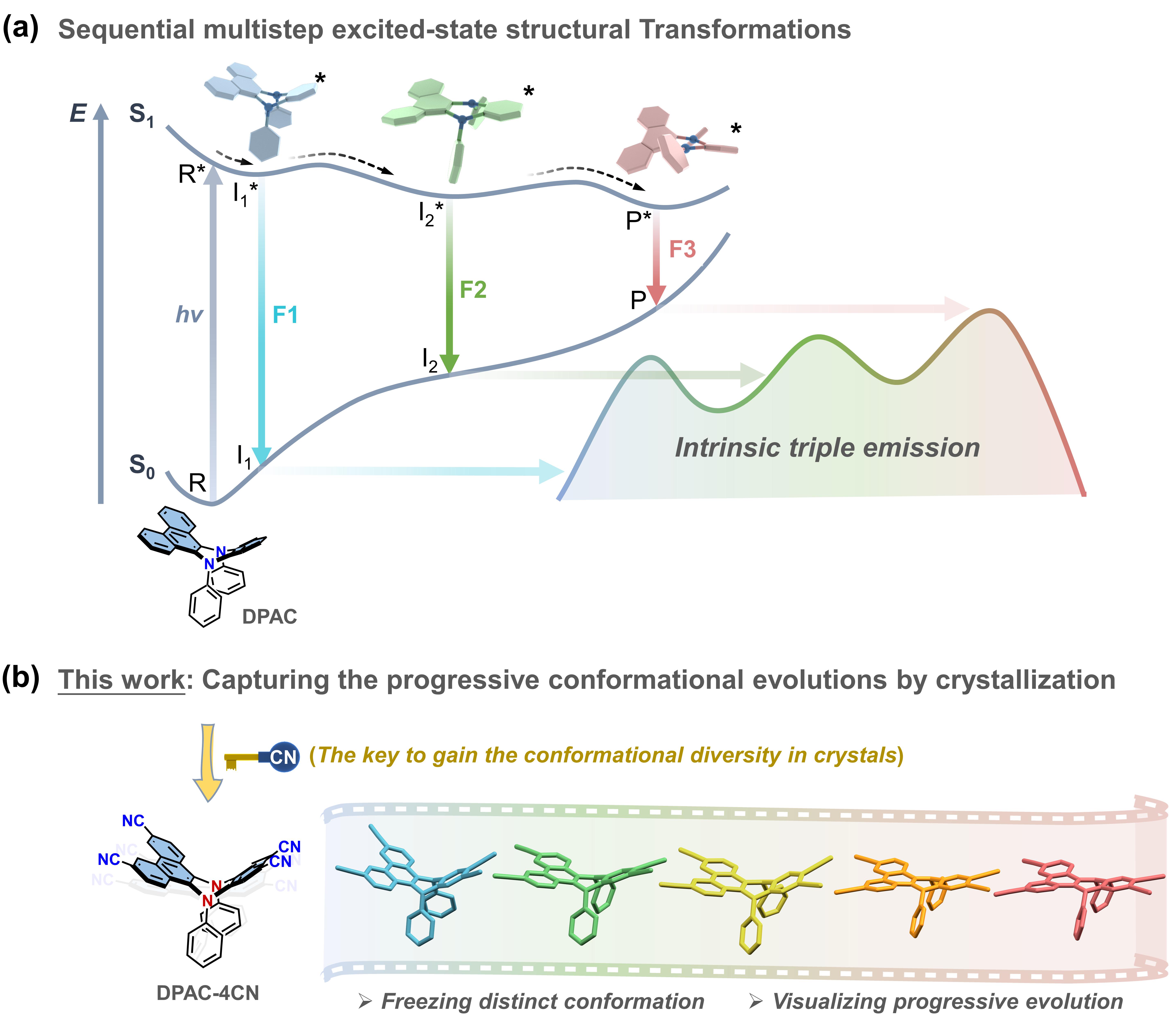 N,N′-二苯基二氢二苯并[a,c]吩嗪(DPAC)为代表的位阻型二氢吩嗪因其独特的振动诱导发光性质而备受关注。DPAC分子在光激发后能够经历从弯曲、平面到扭曲的逐级构象演变,展现出独特的本征三重发射特性。在此前的研究中,田禾院士团队通过分子工程策略结合瞬态光谱和理论计算,系统揭示了结构变化与发射特性之间的关系(J. Am. Chem. Soc., 2022, 144, 4883; Angew. Chem. Int. Ed., 2023, 62, e202305572)。然而,目前仍缺乏直接的实验结构证据来清晰展示其构象演变过程。为此,该团队巧妙地通过化学修饰引入氰基(CN)作为吸电子基团,设计合成了一系列不同氰基取代数量的DPAC衍生物。氰基的引入有效调控了DPAC分子骨架的电子分布,并降低了构象转变的能量障碍,使这些分子在结晶过程中展现出丰富的构象多态性。这一策略有效地“冻结”了DPAC分子的不同构象,为直观地分析分子骨架奠定了基础。
