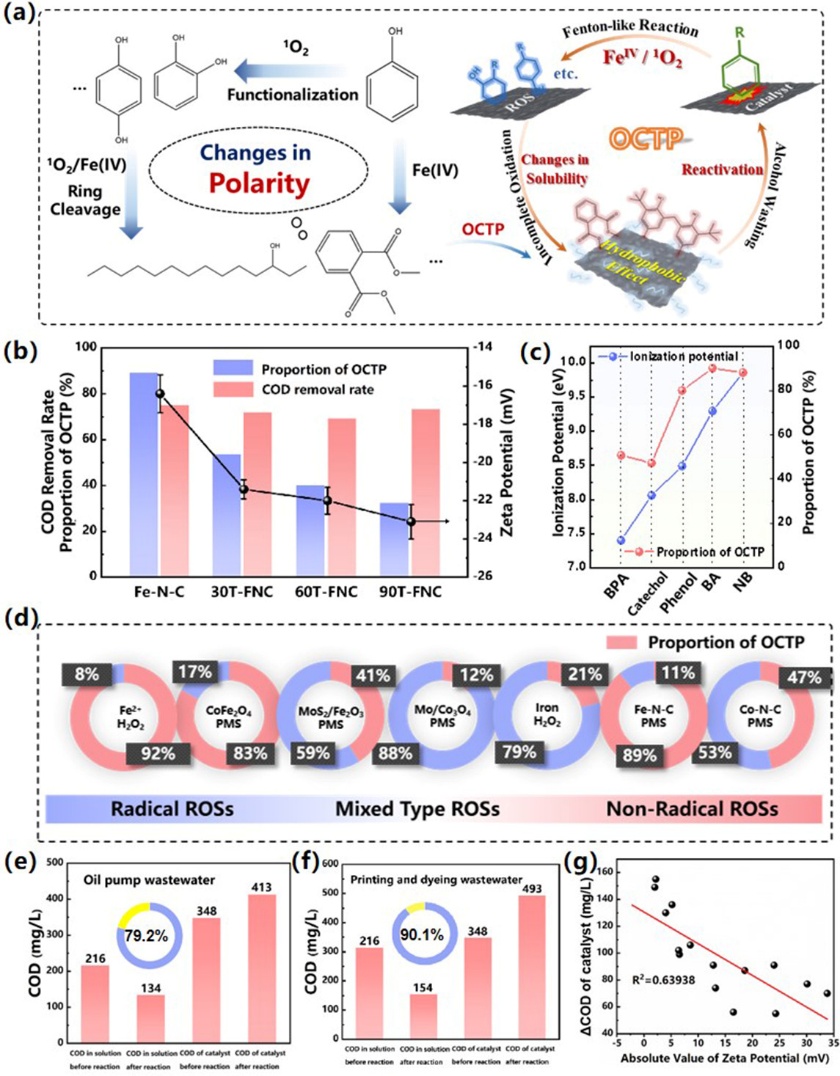 1(a) 基于疏水效应的OCTP(b) OCTP与催化剂表面极性的对应关系;(c) OCTP与有机物IP值的对应关系;(d) 不同AOPs体系中的OCTP(e) 油泵废水和 (f) 印染废水处理过程中的OCTP(g) OCTPZeta电位绝对值的关系