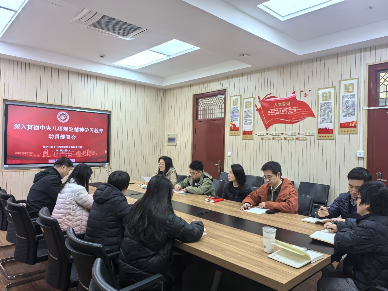 根据化学学院党委关于深入贯彻中央八项规定精神学习教育实施方案及相关会议、文件精神,3月29日至4月2日,各师生党支部相继召开深入贯彻中央八项规定精神学习教育动员部署会暨集体学习。