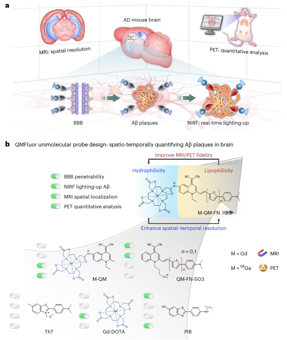 近日,生物医学工程领域国际顶级学术期刊《自然-生物医学工程》(Nature Biomedical Engineering)以“Multiplex imaging of amyloid-β plaques dynamics in living brains with quinoline-malononitrile-based probes”为题,在线发表365英国上市集团官网化学与分子工程学院光敏产品研究中心朱为宏院士、郭志前教授团队超敏分子探针脑部β-淀粉样蛋白(Aβ)斑块成像领域取得的重要突破。该研究基于喹啉腈染料母体“QMFluor”首创“一体化Aβ探针”,实现活体大脑中淀粉样斑块的近红外荧光(NIRF)、磁共振(MRI)及正电子发射断层扫描(PET)时空分辨动态成像,为阿尔茨海默症(AD)的病理机制解析和精准诊疗提供时空分辨检测新工具。
