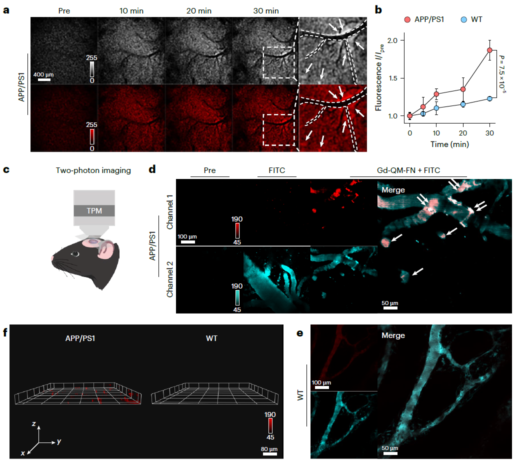 基于此染料分子创新策略开发的QM-FN-DOTA探针,在活体Aβ检测中成功实现了:动态可视化示踪: 通过脑部双光子荧光显微成像,实时监测探针穿越脑血屏障并点亮Aβ斑块全过程;空间定位与定量检测:MRI精准定位脑部海马区与皮层斑块空间分布,PET-CT定量分析正常鼠与AD鼠脑部摄取;跨模式多物种验证:在比格犬模型中证实探针的BBB穿透性与临床兼容性,为转化医学奠定基础。