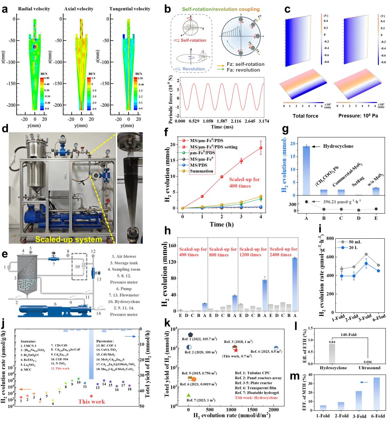 邢明阳教授团队与付鹏波副教授团队在前期废水产氢相关研究(PNAS, 2023, 120, e2218813120)的合作基础上,通过批量合成MoS2压电催化剂,并引入商品化微米铁粉(μm-Fe0)作为无机助催化剂以及过硫酸钾(PDS)作为热力学助剂,成功构建了拓展型高级氧化耦合压电催化体系(batch-MS/μm-Fe0/PDS),并将该体系应用于压电催化海水制氢资源化过程。之后,研究团队进一步将水力旋流器与该催化体系结合,率先构建了水力旋流激发的规模化(20 L)压电催化海水制氢系统,该系统达到了0.73 L/h的产氢速率。此外,该研究还报道了规模化压电催化过程中的宏观能量利用率:该体系中水的机械能转换成氢能的效率达到了36.82%,电能转化为氢能的效率为传统超声波清洗机的140倍以上。此外,研究团队依据压降数值,计算出水力旋流器生产1 Nm³ H₂的理论能耗仅为5.78 kWh,这一数值与工业电解水制氢技术的能耗(约5 kWh)十分相近,证实了该技术在实际应用层面的可行性与。在对催化体系进行从50 mL到20 L的规模化放大实验过程中,该体系成功保持了80%以上的催化活性,率先实现了水力激发的规模化压电海水制氢,为推进压电催化的工程化应用提供了重要参考。值得一提的是,目前在实验室条件下被广泛采用的超声机压电催化反应系统存在能耗高、长时间反应过热、功率衰减快、无法等比例放大等缺点,相比之下,能耗更低的中小型旋流器有望取代超声机成为实验室以及未来产业化首选的压电催化产氢装备。