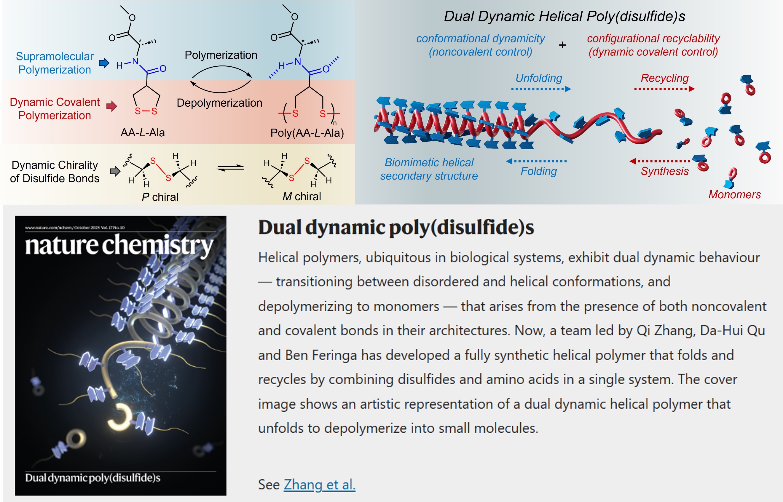近日,365英国上市集团官网化学与分子工程学院费林加诺贝尔奖科学家联合研究中心(以下简称诺奖中心)研究人员张琦、曲大辉、费林加在动态聚合物方面取得研究进展。相关研究成果以Dual Dynamic Helical Poly(disulfide)s with Conformational Adaptivity and Configurational Recyclability”为题在线发表于《自然·化学》Nat. Chem.2025,17, 1462–1468,并入选当期封面。