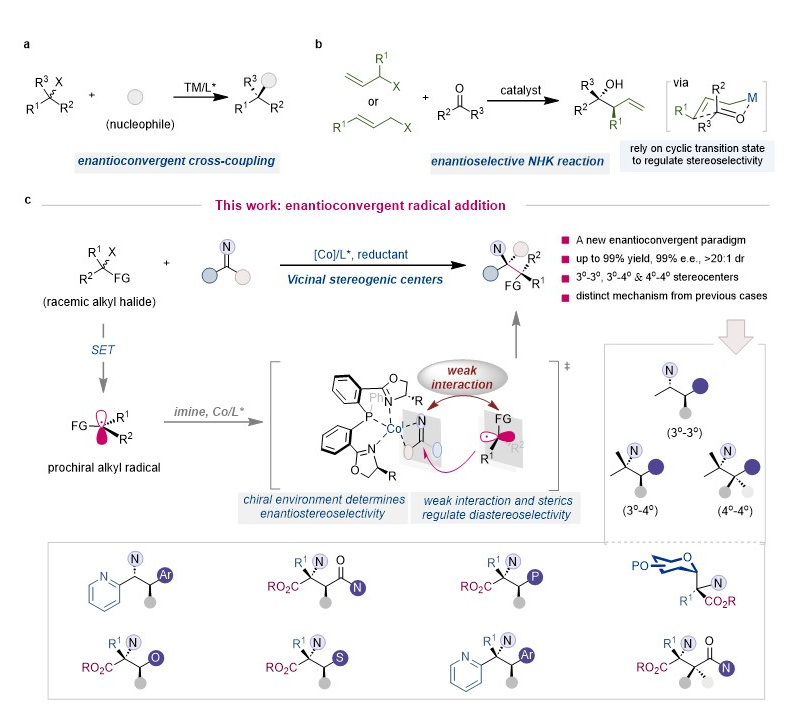 针对上述科学问题,陈宜峰课题组近期提出不对称还原加成新策略,以稳定易得的有机亲电试剂替代传统金属有机试剂,直接构筑手性碳碳键,并受邀在中国化学会旗舰期刊CCS Chemistry撰写综述,与合作者系统总结该领域的研究进展(CCS Chem.2025, doi: 10.31635/ccschem.025.202506433)。在本次发表于Nature Chemistry的研究中,课题组成员在手性钴催化剂调控下,发展了外消旋烷基卤代物与亚胺的对映汇聚式还原加成反应,成功实现了连续手性中心(3°-3°、3°-4° 与 4°-4°)的高效构建。该反应条件温和,底物适用范围广,能够以优异的对映选择性和非对映选择性,合成多种含连续立体中心的手性季碳氨基酸、有机膦化合物、氨基醇、γ-内酰胺及C-糖基氨基酸等重要结构单元,为复杂手性分子的高效简洁合成提供了创新性解决方案。此外,课题组通过机理实验揭示了反应路径,并结合天津大学黄跟平课题组完成的DFT理论计算,对反应的立体选择性控制机制作出了合理解释。