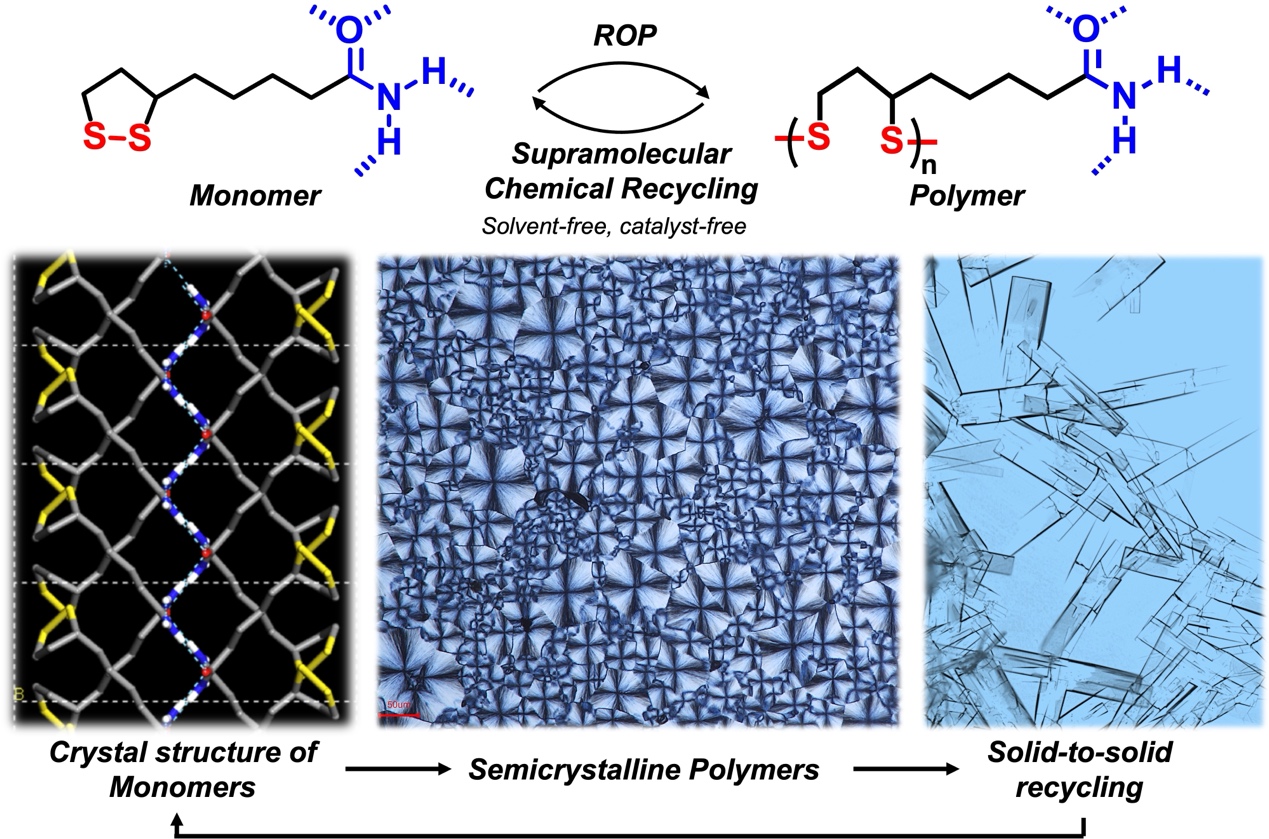 现代社会的可持续发展目标要求经典高分子材料从传统的线性工业模式向循环生产模式转变。开发可闭环化学回收的新型高分子材料为实现未来塑料循环经济提供理想的化学解决方案。当前的可闭环化学回收高分子设计思路主要聚焦于分子工程策略,例如通过取代基效应精细调控环状单体分子的环张力,以设计兼具聚合性和解聚性的“近平衡聚合物”ΔGp ~ 0。然而,这一策略在本质上需要牺牲聚合性以提升解聚性,在单一封闭体系中难以突破热力学的焓熵补偿原则限制,解聚过程往往需要溶剂或热量作为熵驱动力以实现高效解聚,这使现有高分子的闭环化学回收工艺往往伴随着较高的碳排放(溶剂、分离、加热等)。如何突破现有化学回收技术的局限性、开发低碳、无溶剂、甚至无催化剂的聚合物到单体的回收技术仍然是一个开放式挑战。