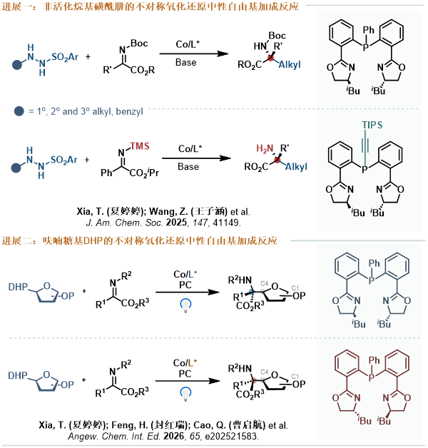 进展一:实现了钴催化非活化烷基磺酰肼与亚胺的不对称氧化还原中性自由基加成反应,高效、高对映选择性地合成了手性α-氨基酯类化合物。需要指出的是,该反应体系首次实现了N-三甲基硅基亚胺酯的不对称自由基加成,并通过原位脱硅过程,一锅法合成手性游离胺类产物,进一步提高了该反应合成应用价值。