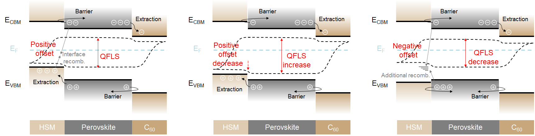 钙钛矿太阳能电池的性能受到钙钛矿与电荷提取界面非辐射复合的关键制约,这限制了其接近热力学效率极限。尽管有大量研究致力于钝化表面缺陷,但界面能级失配在驱动非辐射损耗中的作用仍未得到充分认识。在该工作中,作者通过调控空穴选择性材料的末端基团,系统研究了空穴选择性层与钙钛矿之间的价带顶偏移对电池非辐射复合损耗的影响(图1)。