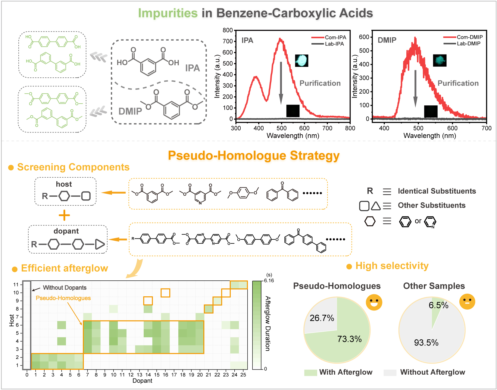 研究团队基于长期以来对苯羧酸类化合物(BCAs)的研究,借助真空升华、柱层析、HPLC等提纯分析手段,证明了其余辉并非固有的光物理性质,而是来自于其中的微量杂质。研究团队通过系统表征确认微量杂质为联苯羧酸及衍生物。值得注意的是,其中一种杂质即使在0.1ppm的掺杂比例下,仍然可以诱导产生明亮的绿色余辉。基于杂质与苯羧酸结构的相似性,该团队发展了一种类同系物策略,用于筛选构建有机余辉材料合适的主体和掺杂剂。在该策略指导下,该团队发现在杂质的结构基础上替换不同的取代基,甚至将苯环替换成吡啶环作为掺杂剂,同样可以诱导苯羧酸衍生物产生余辉。此外,该团队进一步构建了包含不同分子骨架以及不同取代基的275个样品,其中符合类同系物特征的样品中具有余辉的比例高达73.3%,远高于其他样品(6.5%)。这种结构模型为双组分余辉材料的构建提供了新思路。