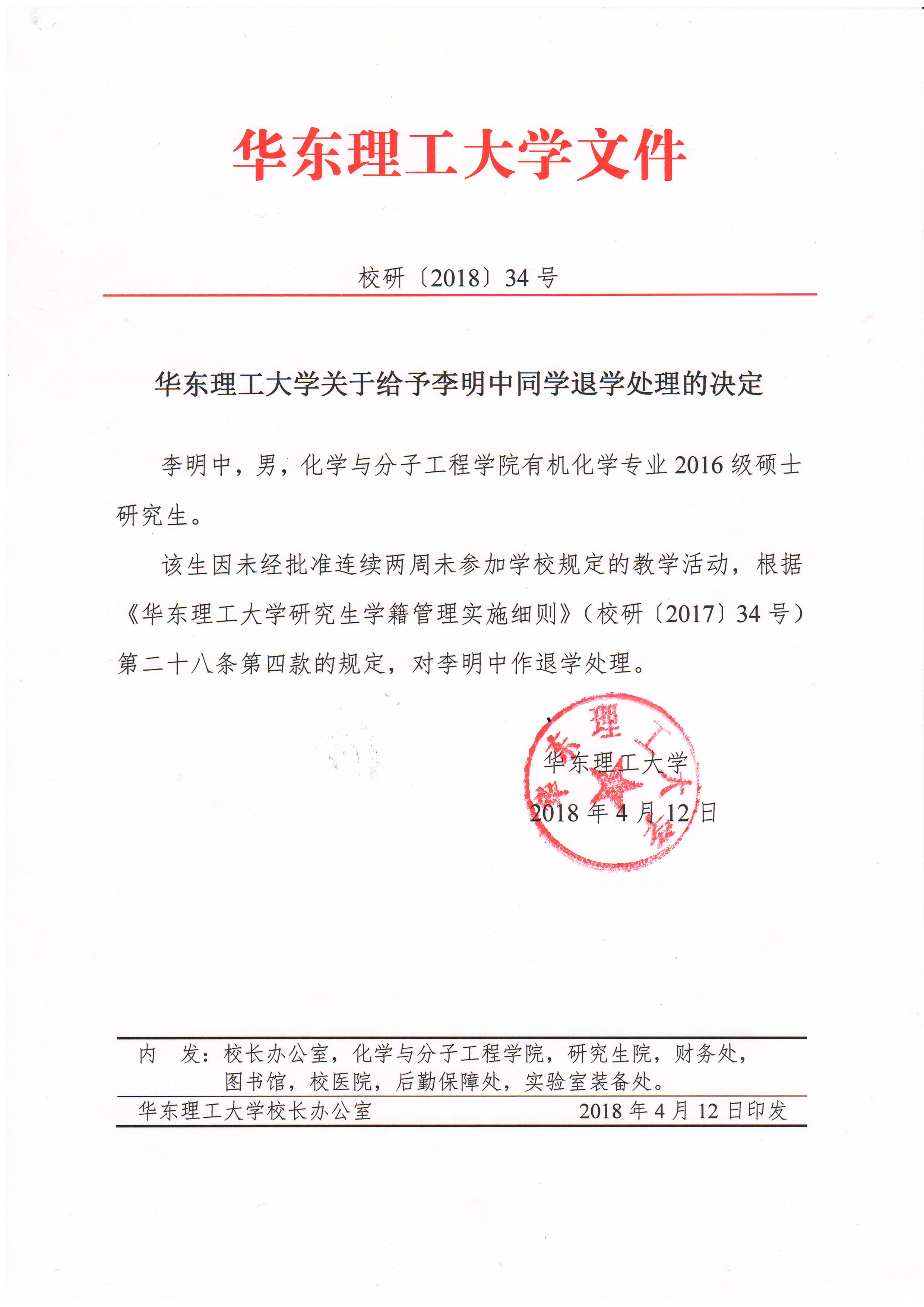 关于对李明中同学退学处理的公告 编号:201801 学校《365英国上市集团官网关于给予李明中同学退学处理的决定》(校研[2018]34号)的退学处理文件已下发到我院(所)。虽经多方联系,仍无法联系上李明中同学(学号Y30160206),以致退学处理文件尚无法送达本人。为此,按照学校《研究生退学办理程序》要求,在我院(所)网上公告送达。如对退学处理有异议,自公告之日起两周内,可向学校学生申诉处理委员会提出书面申诉。
