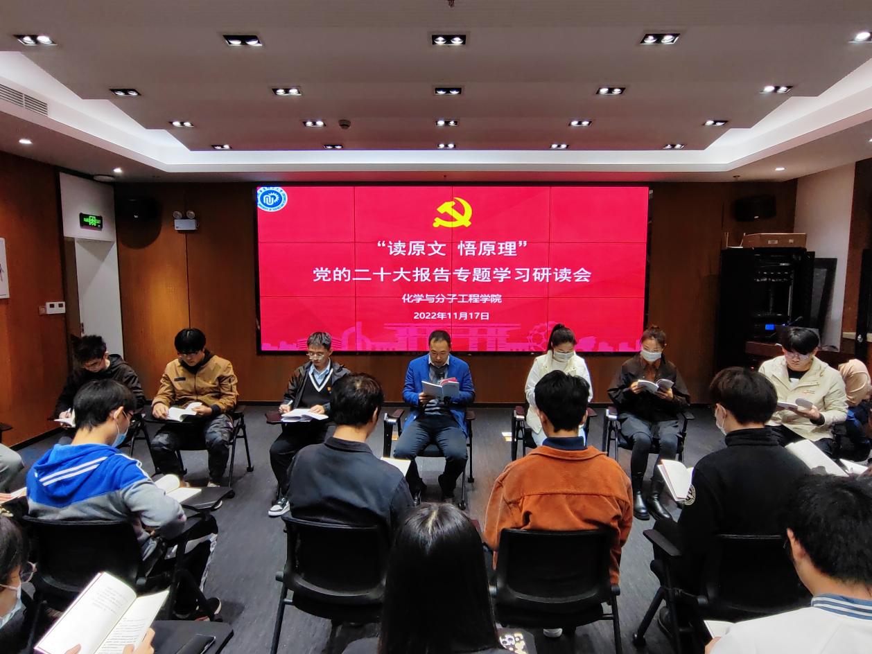 20221117日,化学与分子工程学院精细化工研究生第一党支部与本科生徐汇党支部在费林加诺贝尔奖科学家联合研究中心联合举办了“新党员宣誓老党员重温入党誓词”活动暨“读原文 悟原理”党的二十大报告学习研读会。化学学院院长曲大辉,党委副书记孟庆鹏及支部全体成员参加活动。本次活动由孟庆鹏主持。