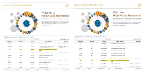 据Thomson Reuters(托马斯路透网站http://highlycited.com/index.htm)介绍,“ Highly Cited Researcher 2014”名录是根据最近11年( 2002-2012 )被ISI Web of Science(SCI)收录的全部自然和社会科学领域论文进行排名,基于ISI Essential Science Indicators℠(ESI,基本科学指标)中的“Highly Cited Papers”(高被引论文)即发表的论文为所属领域中前1%的高引用论文。