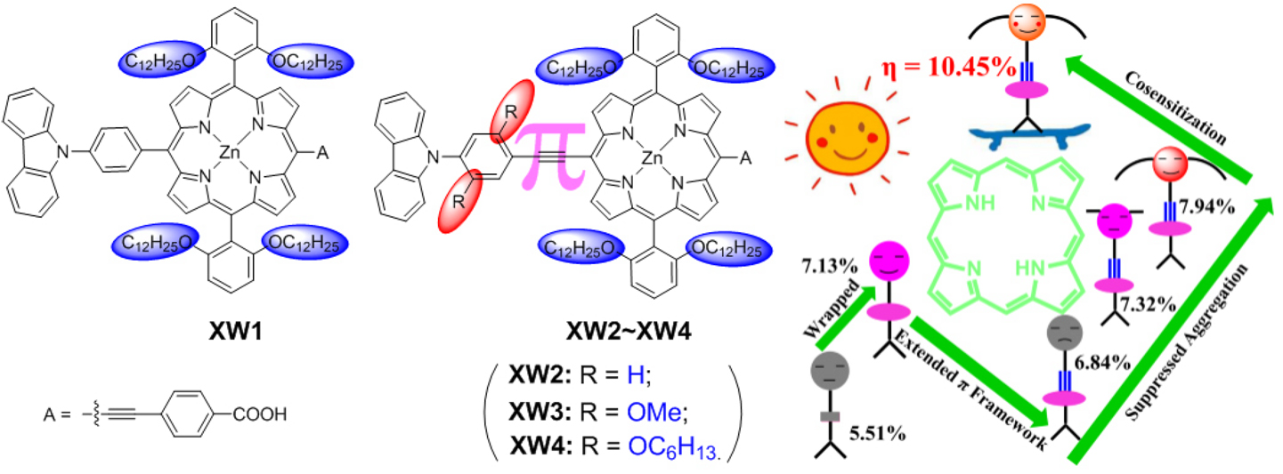 太阳能是一种清洁高效、储量丰富的可再生能源,利用太阳能的一条重要途径是把光能转化为电能。作为太阳能电池家族的重要成员,染料敏化太阳能电池具有光电转化效率高、制作工艺简单等优点,引起了广泛关注。光电转换效率是衡量电池性能的重要参数,而用于捕获光能的敏化剂对电池效率有决定性作用。作为自然界光合作用中心的核心组分,卟啉具有很高的摩尔吸收系数和易于系统修饰的结构,在光能捕获和能量转换方面有着特殊的优势,但其在近红外区和 500 nm 左右存在明显的吸收缺陷。针对该问题,本研究在卟啉分子中引入一个额外的炔键来扩展分子的  共轭结构,增强染料在近红外区的吸收,并在与该炔键相连的苯基上引入烷氧基链来抑制引入炔键导致的染料分子间聚集效应。此外,还进一步设计、合成了一个吸收峰在 500 nm 左右,并具有较大开路电压的纯有机小分子染料,作为卟啉染料的共敏化剂,有效弥补了卟啉染料在 500 nm 左右的吸收缺陷。通过上述卟啉染料结构优化和共敏化的综合策略,最终可同时提高电池的短路电流和开路电压,实现了高达 10.45% 的光电转换效率。此外,本文所发展的卟啉敏化剂均以咔唑基团为电子给体,突破了高效卟啉染料常用的二苯胺电子给体的局限,为发展含不同电子给体的高效卟啉染料、进一步提高电池效率提供了新的思路。