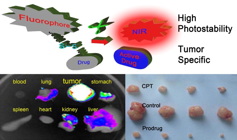 该研究成果利用肿瘤微环境的调控,集诊断、治疗为一体,发展了还原型谷胱甘肽(GSH)响应的高稳定性近红外荧光染料,充分利用吡喃腈(DCM)染料单元的近红外长波长荧光在生物活体成像中的独特优势,成功实现了在体、原位活体成像监测以及肿瘤前药的可视化控释。特别值得指出的是,该系列近红外染料具有远胜于商用菁染料的光稳定性、优异的肿瘤靶向激活特性。