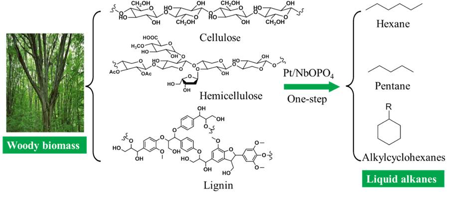 365英国上市集团官网化学与分子工程学院王艳芹教授课题组近期在生物质催化转化领域取得突破性进展,《自然-通讯》近日在线报道了该工作“Direct hydrodeoxygenation of raw woody biomass into liquid alkanes” (Nat. Commun. 2016, DOI: 10.1038/ncomms11162)。 从可再生的生物质生产可持续的燃料对于我们摆脱对化石燃料的依赖越来越重要。植物秸秆及农林废弃物等木质生物质主要由纤维素、半纤维素和木质素三部分组成,由于其成分复杂、结构稳定,因此在催化转化过程中通常需要对其进行预处理和分离,然后再针对各组分分别转化,周期长、能量效率低。该成果创新性地构建了多功能的Pt/NbOPO4催化剂,使得木质生物质在不经过化学预处理或分离的情况下在温和的条件下直接完全脱氧加氢,得到液态烷烃(纤维素、半纤维素和木质素组分分别转化为己烷、戊烷和烷基环己烷),质量收率高达28.1 wt%,这是首次通过催化转化的方式实现原生生物质到液态烷烃的直接转化。在该多功能Pt/NbOPO4催化剂中,NbOx物种起到了决定性的作用,其既作为酸中心发挥水解、脱水的作用,同时又具有活化C-O键的能力,促进脱氧加氢过程的进行,这进一步得到了DFT理论计算和原位非弹性中子散射实验的证实。该成果为利用木质生物质资源制备可再生燃料提供了新途径,可以节约大量能耗;同时对于生物质催化脱氧加氢制备生物汽油、生物航煤和生物柴油也具有非常重要的意义。