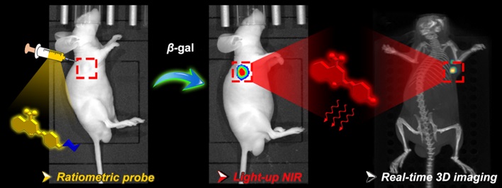 β-半乳糖苷酶是细胞衰老过程和原发性卵巢癌等相关疾病的重要标志物,以苯并吡喃腈荧光团为近红外染料信号基团,该课题组巧妙地构建了对β-半乳糖苷酶特异性识别的近红外比率型荧光探针,检测β-半乳糖苷酶时表现为比率型和增强型近红外信号响应两种模式,成功实现了对活细胞中内源性β-半乳糖苷酶的定量检测,利用近红外特异性、高灵敏性荧光响应信号对β-半乳糖苷酶过表达的肿瘤组织实现精准定位。
