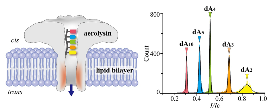 生物纳米孔单分子分析技术的原理是通过电场力驱动单链DNA穿过纳米尺寸的孔道,由于不同的碱基(A,T,C,G)通过纳米孔道时产生了不同阻断程度和阻断时间的电流信号,由此可根据电流信号读出每条DNA序列上的碱基信息。但在实际实验过程中,单链DNA穿过纳米孔的速度极快(约1微秒/碱基),且电流阻断信号极小(~皮安级),阻碍了纳米孔DNA测序技术发展。 |
