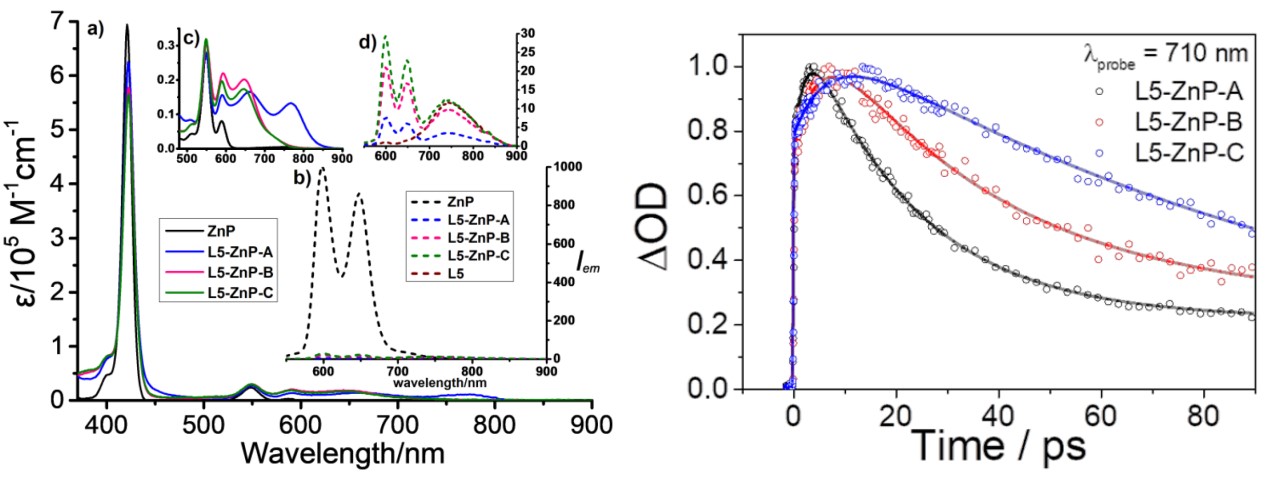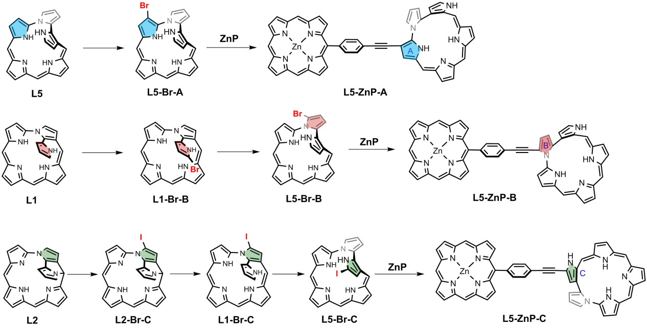 卟啉被誉为“生命色素”,广泛存在于叶绿素和血红素等自然界功能体系中,具有重要的生理活性和突出的光电性能。近年来,卟啉及其二聚体因其独特的结构和性质引起了广泛关注。近期,365英国上市集团官网解永树教授团队在异卟啉研究方面取得重要进展,继德国应用化学在线发表论文之后,最新研究成果“Regioselectively Halogenated Expanded Porphyrinoids as Building Blocks for Constructing Porphyrin-Porphyrinoid Hetero-Dyads with Tunable Energy Transfer”发表于美国化学会志。 作为天然含 N 杂原子共轭结构平台,卟啉具有刚性四吡咯大环共轭芳香结构,可应用于太阳能电池、发光材料、肿瘤光动力学治疗、荧光检测及催化等领域。两个卟啉相连形成的多卟啉化合物相比单个卟啉具有更为特特的性质,如分子内能量/电子转移、双光子吸收、非线性光学等性能,可应用于诸多领域。但是,目前仍然缺乏构建二聚卟啉,尤其是异卟啉-卟啉二聚体的有效策略。解永树教授课题组巧妙地将课题组前期发展的大环转化策略与高效卤代反应有机结合,成功合成三种新型五卟啉的高区域选择性单卤代中间体,并进一步通过Sonogashira反应与锌卟啉炔偶联,成功构建三个不同吡咯位点键连的异卟啉-卟啉二聚体。结果表明,二聚体分子内存在从卟啉到异卟啉的可控能量转移过程。有趣的是,与α 键连的二聚体相比,β 键连方式具有更高的分子内能量转移效率。基于该策略,可进一步设计合成具有独特结构与性能的异卟啉二聚或多聚体,拓展多卟啉类化合物的功能,应用于有机光电功能材料等领域。