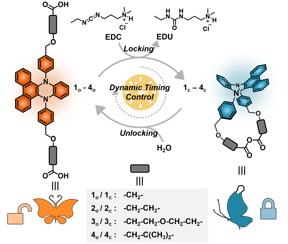 构建智能荧光材料的关键是实现对发光性能的有效精准调控。目前,常见的策略是将刺激响应结构单元引入发光分子,使其在不同热力学稳态之间受激切换。然而,如何实现时间尺度上的动态荧光调控还存在很大的挑战,主要难点在于如何在系统中实现动力学控制。近日,365英国上市集团官网化学与分子工程学院、费林加诺贝尔奖科学家联合研究中心曲大辉教授课题组通过功能化修饰,将具有振动诱导发光性质的荧光团和化学燃料体系结合,成功构建了一系列不同发射和寿命的时间编码动态荧光系统,最新研究成果以“Dynamic timing control over multicolor molecular emission by temporal chemical locking”为题发表在Angew. Chem. Int. Ed. (DOI: 10.1002/anie.202116414)。