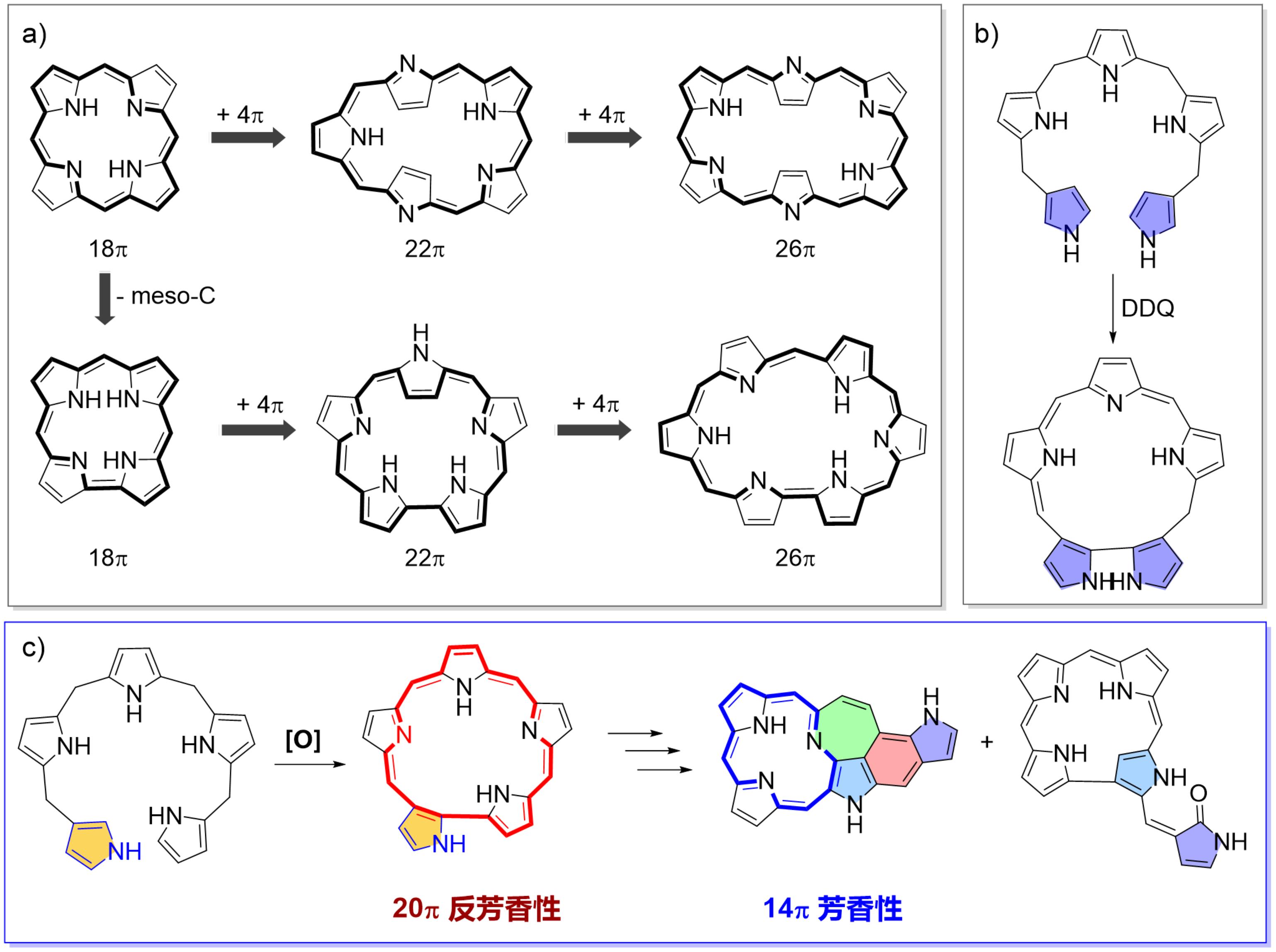 芳香性质是有机化学领域的重要科学问题和研究内容。与芳香性分子相比,反芳香性化合物往往具有较小的能带隙和更高的电荷迁移率,在高性能有机半导体、储能材料等领域具有良好应用价值。但是,反芳香性分子稳定性一般较差,相关研究进展较为缓慢。作为“生命色素”,卟啉具有重要生理活性和突出的光电性能,通过改变卟啉大环母体结构则可以得到的卟啉类似物异卟啉 (porphyrinoids),从而开发更加丰富的结构与性能。从理论上来说,其独特共轭大环结构可望成为构建反芳香性分子的理想平台,但相关研究仍处于起步阶段。