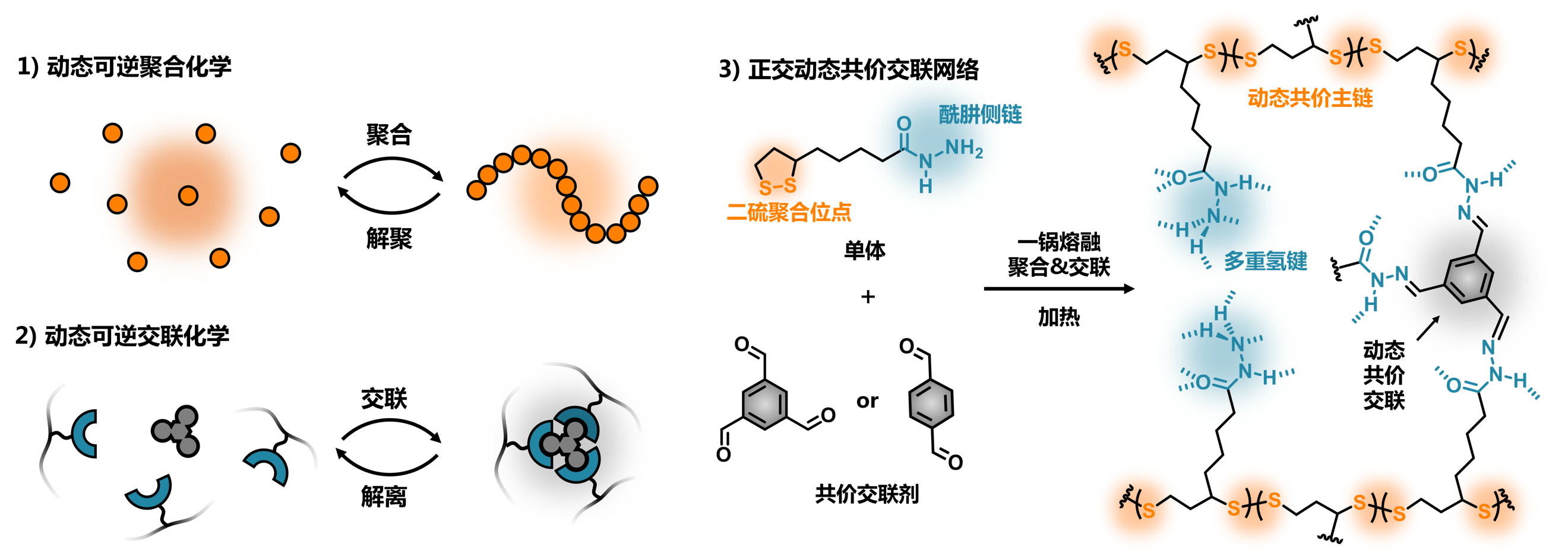 聚硫辛酸材料的化学闭环回收概念已在课题组前期工作基础中得到验证(Matter, 2021, 4, 1352-1364)。但该聚合物材料仍然属于超分子交联网络,按照机械性能分类仍然属于软材料范畴,难以应用到工程塑料级别。共价交联是提升材料机械强度的最直接和有效的方式,但是目前绝大多数的共价交联材料都难以实现闭环化学回收。研究人员利用两种正交动态化学(二硫聚合反应和酰腙交联)构筑了可化学回收的高性能动态聚合物网络。由于超分子化学(网状氢键交联)和动态共价化学(二硫键、酰腙键)的协同相互作用,所得材料兼顾了优异的机械性能和动态性。聚合物材料的解聚过程可利用酰肼基元的亲核性自催化聚合物在稀溶液中关环解聚成单体实现,解交联过程则可利用过量酰肼、羟胺实现动态置换,实现了高性能共价交联聚合物材料的简单、高效、闭环化学回收,为设计和构建高性能可化学回收塑料提供新策略。