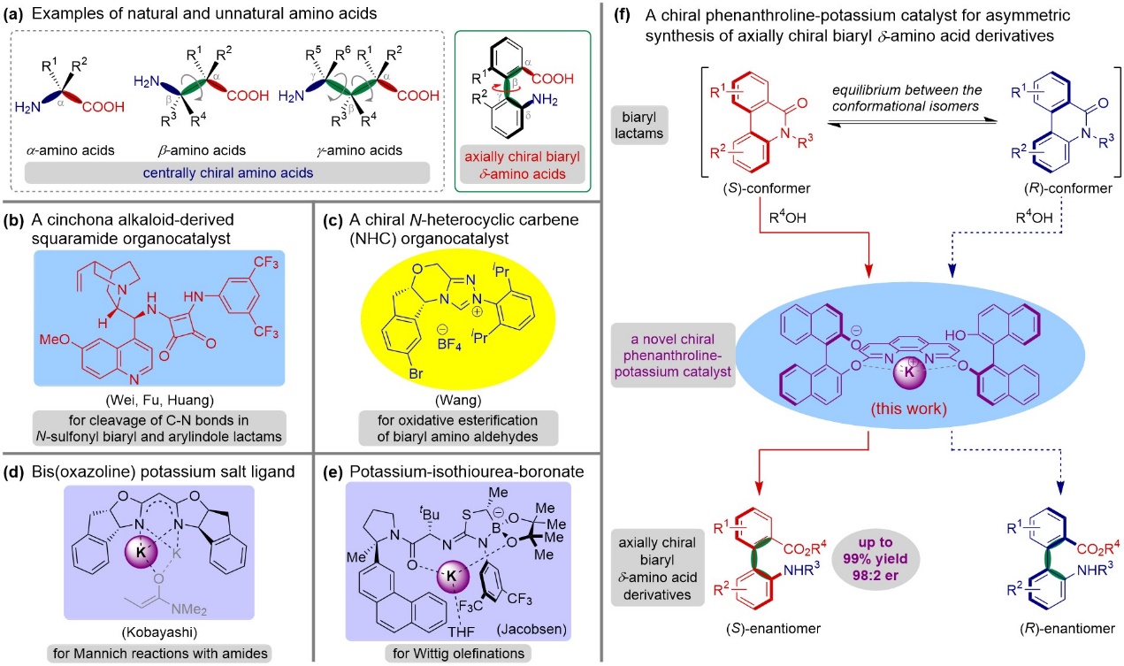 图1. 研究背景和新型轴手性菲罗啉钾络合物用于非天然轴手性氨基酸的催化合成