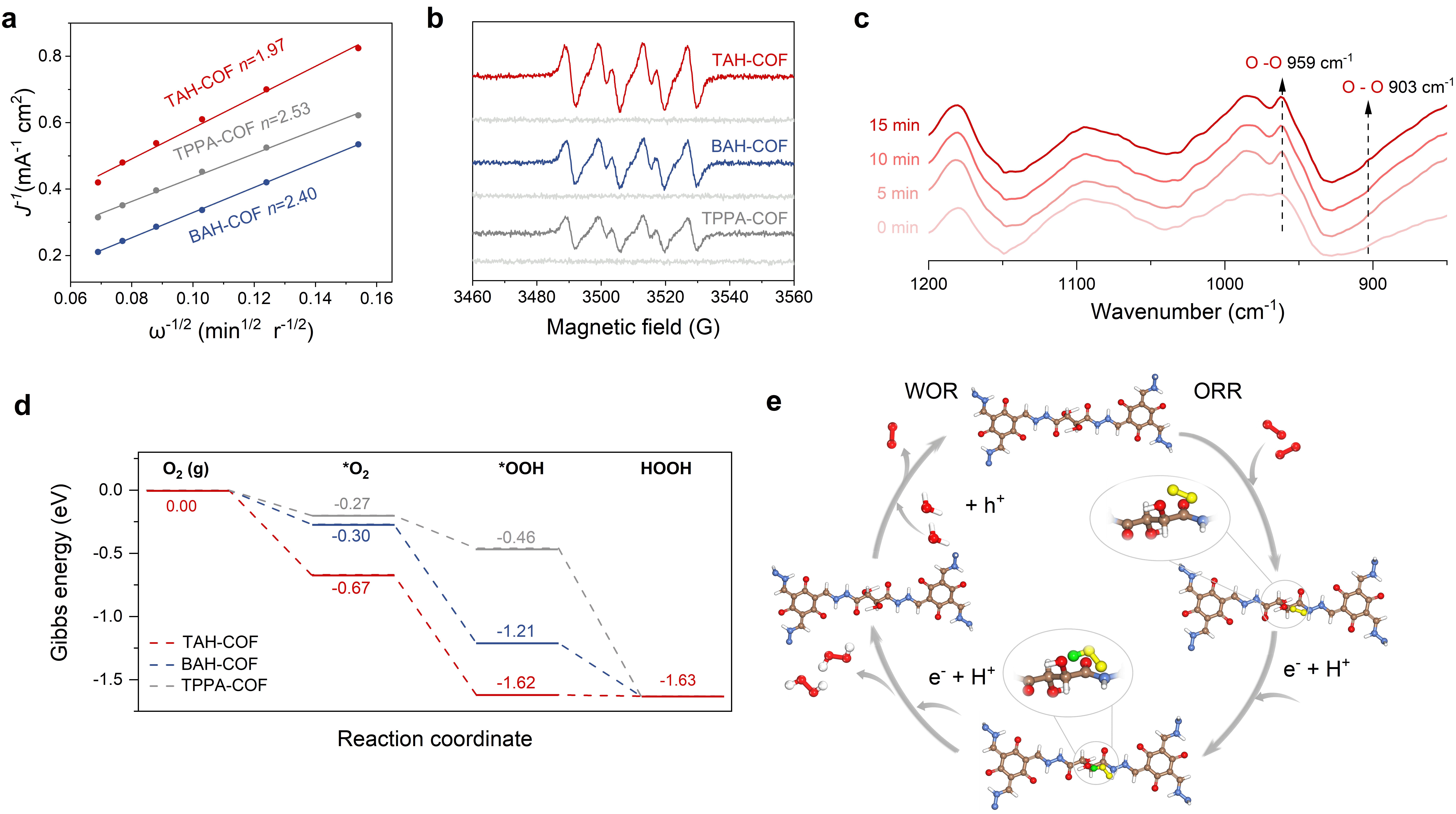 图2:TAH-COF光催化合成H2O2性能。 酒石酸链强化光催化氧还原反应过程 除了TAH-COF催化剂亲水性和吸收光谱的拓宽,原位红外光谱和理论计算还表明酒石酸链可以增强氧气的吸附并稳定*OOH中间体,从而强化分步的两电子氧还原反应过程(图3)。具体而言,原位红外光谱表明TAH-COF通过两步单电子途径将水中的O2还原成H2O2。氧气吸附等温线测试显示TAH-COF具有优越的O2亲和力。DFT计算表明吸附在酒石酸链上的O2相比于芳香环单体更容易激活形成*OOH中间体。此外,*OOH中间体可以通过与羟基和酰胺基团形成两个氢键而稳定吸附在酒石酸链上,有利于后续的质子化过程产生H2O2。