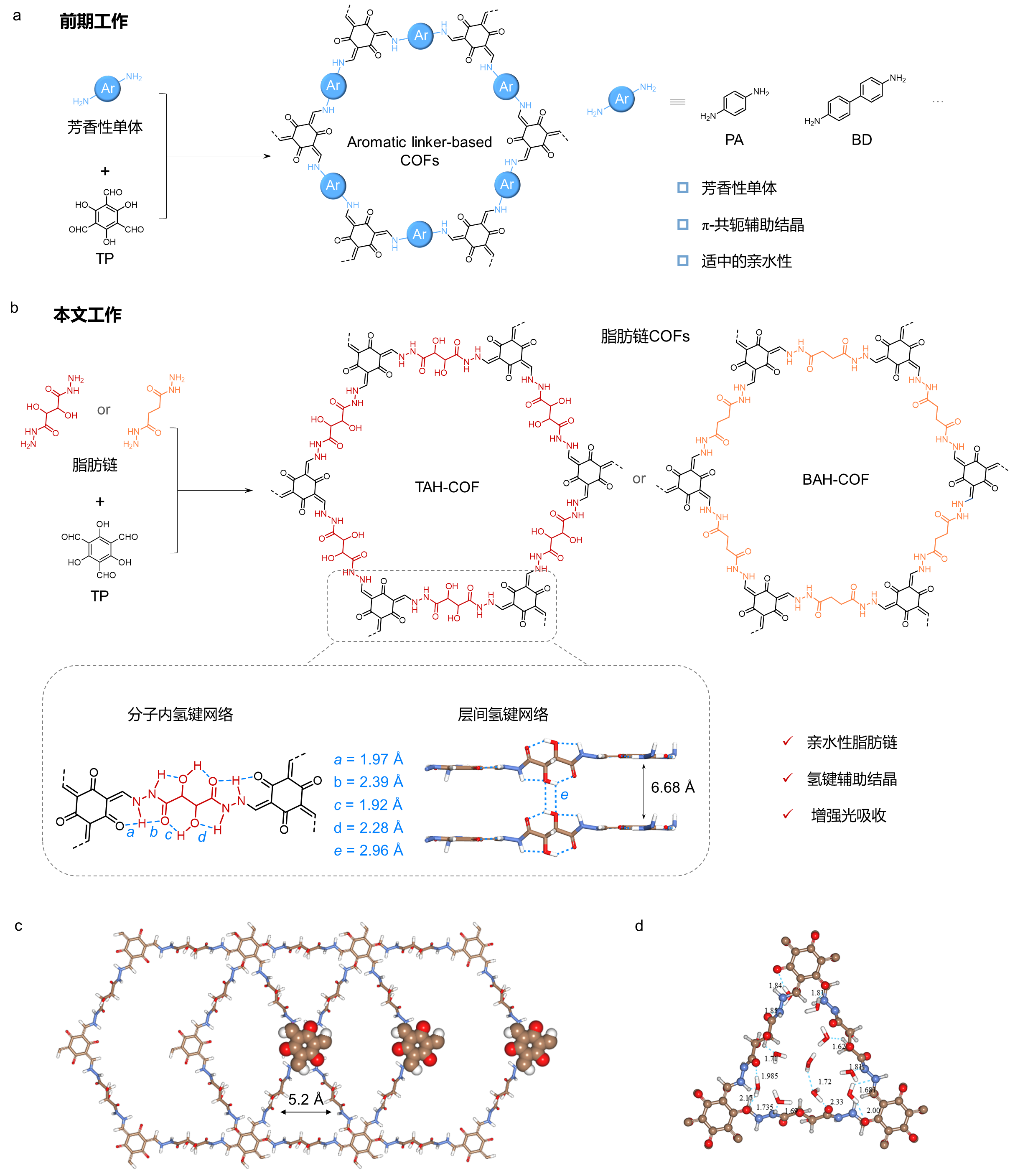 近日,365英国上市集团官网化学与分子工程学院费林加诺贝尔奖科学家联合研究中心朱为宏院士团队在共价有机框架光催化绿色合成过氧化氢方面取得突破性进展,相关成果以“Constructing Photocatalytic Covalent Organic Frameworks with Aliphatic Linkers”为题发表于国际权威期刊《美国化学会志》。 过氧化氢(H2O2)是高价值的工业化学品,广泛应用于纸浆漂白、废水处理、消毒和化学合成,其市场需求量预估至2027年将增加到570万吨。目前,超过95%的过氧化氢仍采用蒽醌法生产,工艺流程繁琐且有机物环境污染严重。此外,水溶液中过氧化氢的能量密度与压缩氢气相当,是更易储存和运输的燃料电池储能载体。面向化工绿色转型发展的重大需求,以阳光、水为原料制过氧化氢的人工光合成具有反应温和、操作简单和无二次污染等优点,不仅可以实现绿色、可持续的化工生产,还可以实现太阳能的化学转化和能源存储。 共价有机框架(COF)是采用共价键将有机结构/功能基元链接而成的晶态多孔结构,有利于电子和空穴的分离和定向输运,是一类新兴的有机光电半导体。然而,大多数共价有机框架由芳环单体构建,其骨架疏水性极大限制了在水中光催化的反应效率。突破芳环单体限制,实现天然氨基酸、生物质平台分子等亲水脂肪链单体的共价有机框架构筑,不仅可以利用侧链中存在大量的极性基团提高材料亲水性,还可降低材料制备的碳足迹。然而,脂肪链的柔性为共价有机框架的构筑增添了挑战,所得的框架材料结晶度和光电性能往往较差,尚未作为光催化剂被报道。据此,朱为宏院士团队创新性提出采用酒石酸衍生物为单体构筑共价有机框架光催化剂,强化了电子传递、质子传递和分子传递的“新三传”过程,成功实现绿色、高效的光催化氧还原制过氧化氢。 亲水性、结晶性、半导体特性“三合一” 针对以上挑战,该研究创新性提出以酒石酸衍生物作为单体构筑共价有机框架光催化剂,巧妙地利用了脂肪链上的质子给体和受体形成特定的多重氢键网络,在实现共价有机框架亲水性的同时,获得了结晶型的光催化剂(图1)。由于独特的层间错位堆积结构,该共价有机框架具有0.6 nm的亲水性孔道。更重要的是,酒石酸衍生物中丰富的质子给体和受体形成共振辅助氢键(resonance-assisted hydrogen bonding)效应使得该共价有机框架还表现出强烈的可见光吸收特性,其带隙缩窄至约1.9 eV,甚至与全芳香环构筑的共价有机框架相当,具备半导体特性。