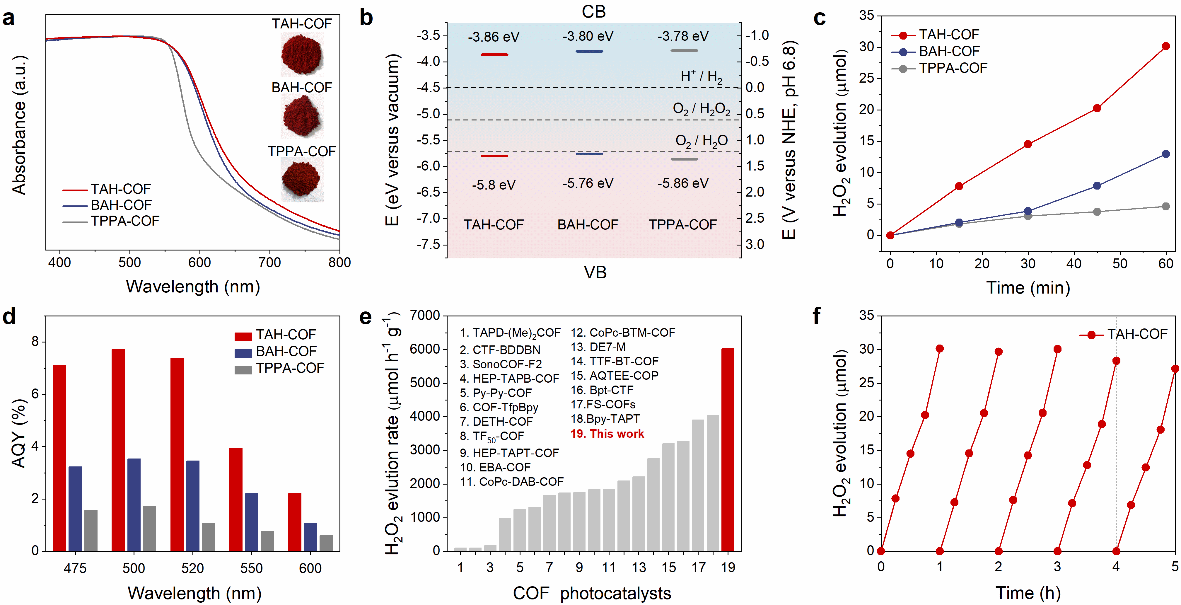 图1:亲水脂肪链共价有机框架光催化剂设计合成 H2O2高效率绿色合成 得益于结晶性、亲水性和半导体特性的理想结合,酒石酸二酰肼构筑的TAH-COF可高效率地从纯水和空气中光催化合成H2O2,生成速率达到了6003 μmol h–1 g–1,太阳能到化学能的转换效率达到0.66%,是共价有机框架类光催化剂的最高值之一(图2)。该催化剂在500 nm处的表观量子效率达到7.72%。此外,得益于框架材料中稳定的酮烯胺键以及多重氢键网络结构,经过5轮的光催化循环测试后其活性仍然能够保持稳定。
