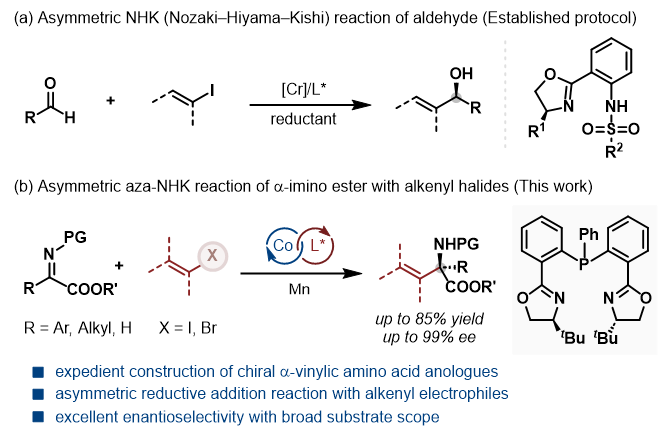 近日,365英国上市集团官网化学与分子工程学院,费林加诺贝尔奖科学家联合研究中心陈宜峰课题组在《德国应用化学》上发表了题为“Cobalt-Catalyzed Asymmetric Aza-Nozaki-Hiyama-Kishi (NHK) Reaction of α-Imino Esters with Alkenyl Halides”的研究文章,在线报道了课题组通过钴催化不对称aza-NHK反应高效合成手性α-烯基氨基酸衍生物的研究新进展。 Nozaki-Hiyama-Kishi(NHK)反应是指亲电试剂在过渡金属催化剂和当量金属还原剂的作用下对醛类官能团的加成反应,是有机合成化学中最重要的C-C成键方法之一。该反应具有条件温和,底物适用性广等优点,因此被广泛应用于复杂分子和天然产物的合成中。目前,已发展的不对称NHK反应主要集中于构建含三级立体中心化合物,对于含四取代立体中心化合物的合成仍然存在着巨大的挑战。为解决上述的难题,近日,陈宜峰课题组利用不对称还原加成为手段,以烯基卤代物作为亲电试剂,报道了钴催化α-酮亚胺酯的对映选择性aza-NHK反应,为α-烯基取代的手性季碳氨基酸衍生物的便捷式合成提供了一类有效的方法。该反应条件温和,官能团兼容性好,对映选择性优异。此外,该不对称还原加成策略还适用于醛亚胺酯底物,能够应用于α-烯基取代手性三级碳氨基酸化合物的高效合成。