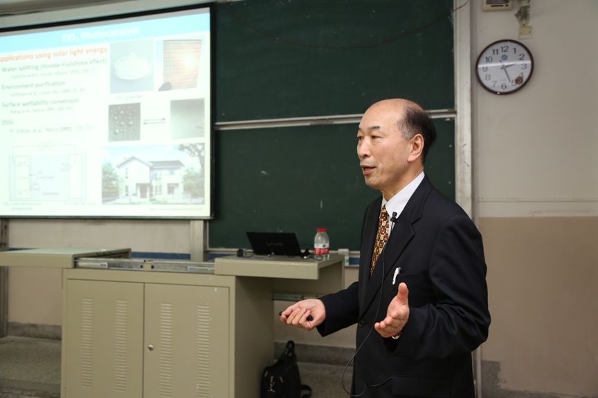 Prof. Majima attended the "Photocatalytic Reactions Using Superstucture TiO2 Crystalline Nanoparticles with Effective Charge Transfer Pathways". Prof. Jinggang Liu hosted the lecture and Prof. YiTao Long, Prof. Yi Cheng also attended the lecture. In this lecture, Prof. Majima introduce the synthesis of supertucture TiO2 crystalline nanoparticles, the methods to measure the charge transfer by single particle fluorescence measurement and the mechanism of photocatalysis by nanoparticles.