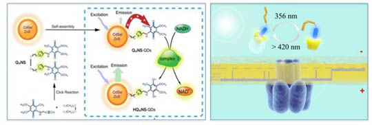 Based on previous research of bio-mimic membrane interface system (Nature Protocols 2013, 8, 439-450), Dr. Ma Wei and Dr. Qin Li-Xia reported a biosensor of complex I using ubiquinone-terminated disulphides with different alkyl spacers as surface-capping ligands to functionalise CdSe/ZnS QDs. The enhancement or quenching of the QD bioconjugates fluorescence changes as a function of the redox state of QnNS, which could be modulated by adding NADH. This performance simulates an electron-transfer system part of the mitochondrial respiratory chain, providing an in vitro and intracellular complex I sensor. This novel QnNS-QDs system has a potential in early stage diagnosis and progression monitoring of Parkinson’s disease by tracing complex I levels in human neuroblastoma SH-SY5Y cells, since epidemiological studies suggest that Parkinson’s patients have the impaired activity of complex I in the electron-transfer chain of mitochondria.