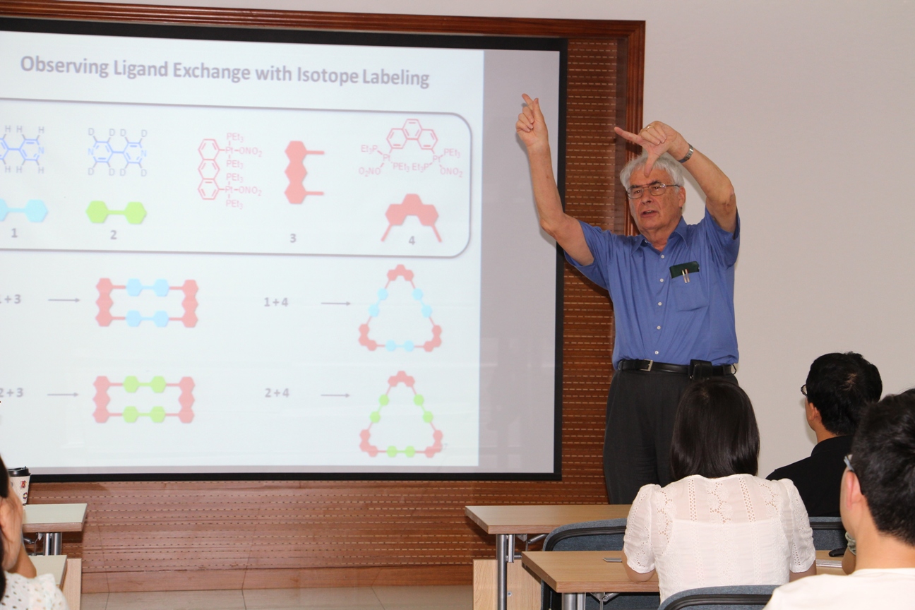Prof. Stang made a detailed introduction on the synthesis and application of molecular self-assembly, including the self-assembly methods of rhombus, pentagon, hexagon, etc. What’ more, the properties of the supramolecular self-assembly, such as solubility, spectral characteristics, electrochemical activity and etc., are also involved. He also focused on the synthesis of 3D polyhedral self-assembly compounds as well as their applications in anti-tumor. After the lecture, Prof. Stang discussed with participants and exchanged opinions.