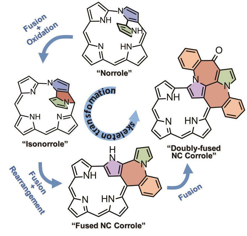 Porphyrins widely occur in natural systems such as chlorophyll and heme, which exhibit important photoelectronic functions. The development of novel porphyrinoids with specific functionality is an interesting research topic for chemists. Especially, the researches on macrocyclic transformations are of importance for developing novel porphyrinoid skeletons with unique properties. As an important class of porphyrinoids, N-confused porphyrins are of particular interests in anion sensing, supermolecular assembly, stabilization of high-valent metals and luminescent materials in the NIR region. Based on their previous work, Prof. Yongshu Xie group develop a new method for the macrocycle transformations of porphyrinoids, and modulate their spectral properties by multiple ring fusion reactions. Based on this method, the researchers in this area may design and synthesize novel porphyrinoids with unique structures and properties to construct novel photoelectronic functional systems.