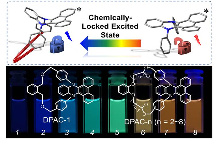 For deeper understanding of VIE mechanism, Tian’s group conceived a series of annulated structures based on dihydrophenazine. Their aim was to impose various degrees of constraint to impede the excited-state structural vibration in hope of controlling the excited-state planarization of the molecules (as shown in figure below). In this study, a series of DPAC-n (n=1-8) derivatives were synthesized, in which n correlates with the alkyl length, such that the strength of spatial constraint increases as n decreases. With the degree of constraint increasing, the probability of excited-state planarization reduced, resulting in a blue shift. As a result, drastic chain-length dependent emission was observed, spanning much of the panchromatic region. For elaborating the mechanism, they once again cooperated with Prof. Chou. Detailed spectroscopic and dynamic studies, together with computational approach, firmly supported the harness of planarization by imposing spatial constraint in DPAC-n, which stepped on a brake during the structure evolution in the excited state. Moreover, severing the linkagefor e.g., DAPC-5by base treatment could release the structure constraint and hence resulted in drastic changes of emission from blue (400 nm) to red (610 nm), demonstrating the perspective as well as versatility for the use of sensing elements.